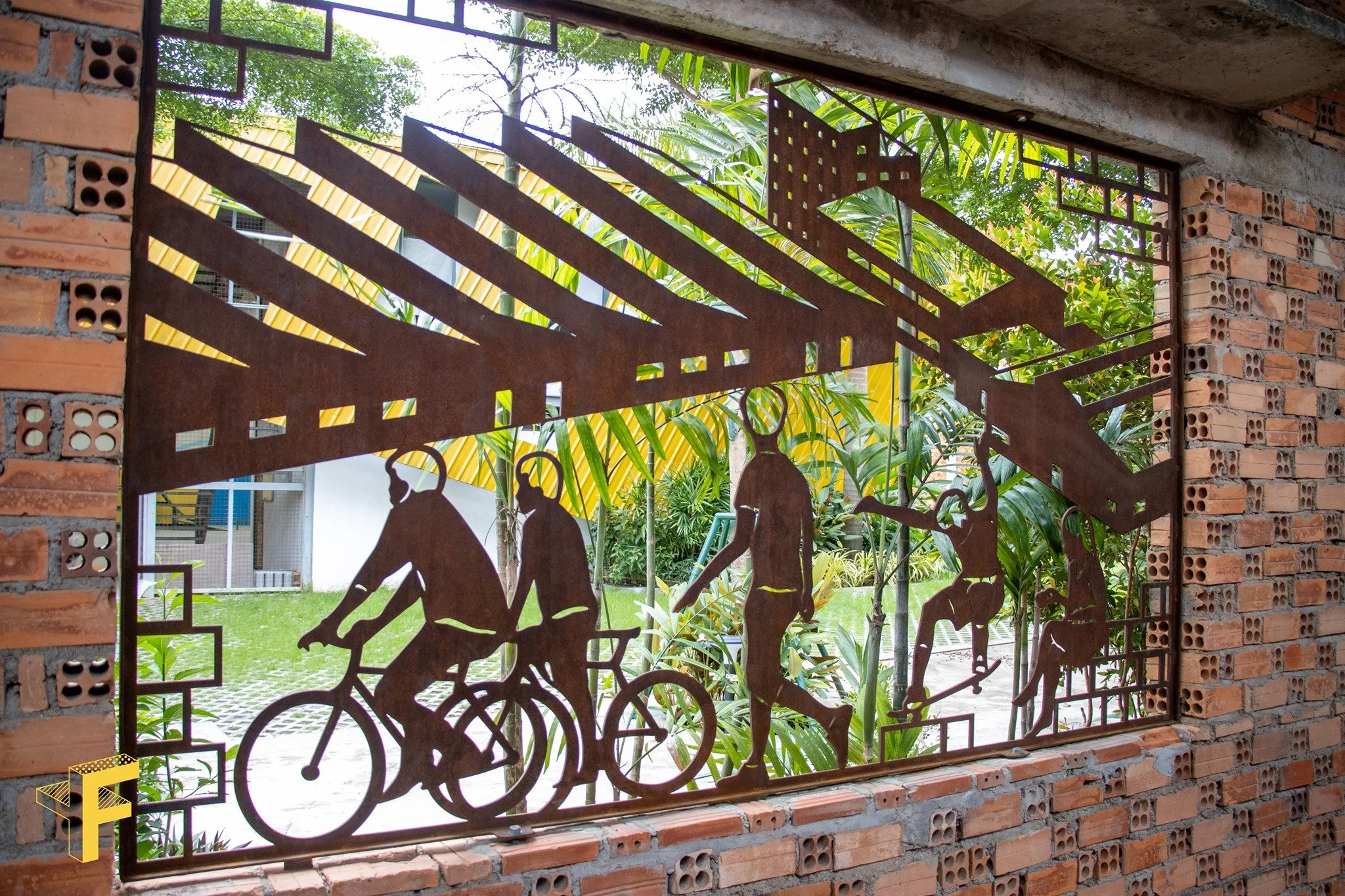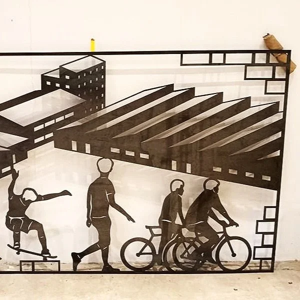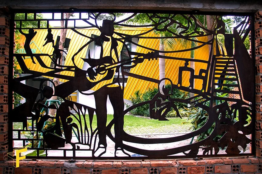 "These three pieces were created to celebrate the unique and vibrant culture of commercial, co-working, and greenspace at Factory Phnom Penh. This collaborative effort between metal artist, Gregory Gosselin (France) and paper cut artist, Lauren Iida (Seattle).