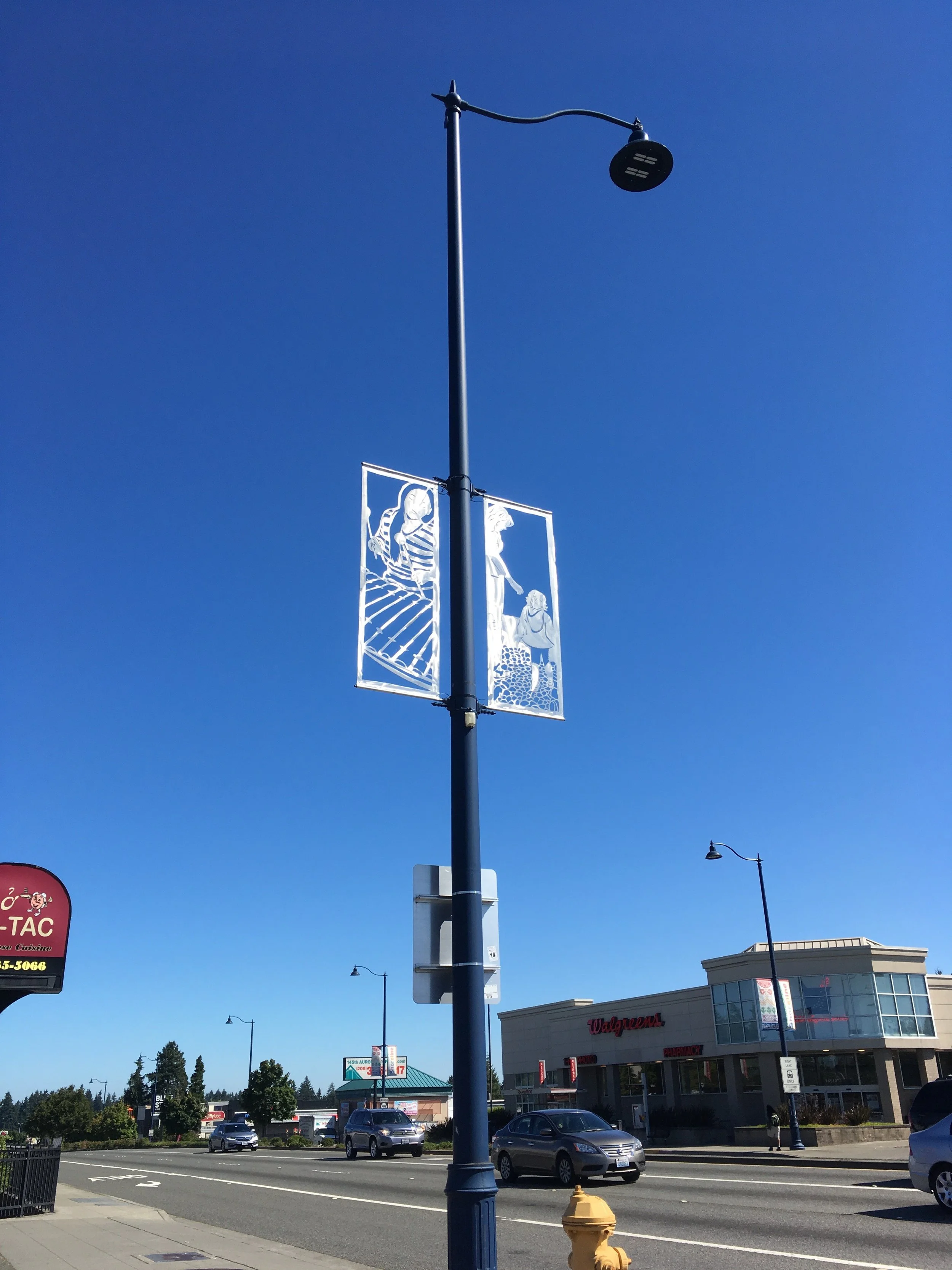 Permanently installed public art on light posts in two locations in the city of Shoreline, Washington along Hwy 99